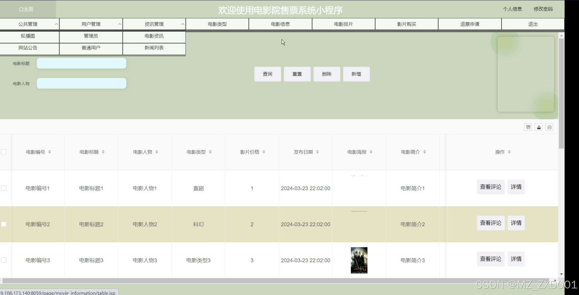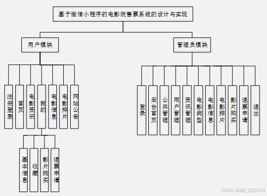 首先,通过对电影售票的需求和用户调研,确定了系统的功能模块和技术方案。然后,采用JAVA Web作为后端开发工具,结合SpringBoot框架、JSP框架和Mysql数据库进行数据存储和管理,实现了用户友好的界面设计和交互效果。最后,开发了一个小程序作为移动端展示。系统主要包括以下几个功能模块:公共管理、用户管理、资讯管理、电影类型、电影信息、电影排片、影片购买、退票申请、退出等功能操作。用户可以通过微信小程序登录系统,首页、电影资讯、我的、电影信息、电影排片、网站公告等功能。