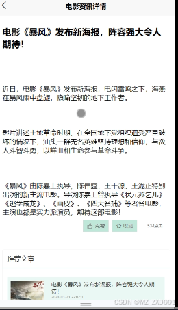 在电影资讯页面,用户可以轻松获取有关电影的详细信息,还可以通过关键字快速搜索,同时还可以进行点赞、评论、收藏等功能,如图5-4所示。