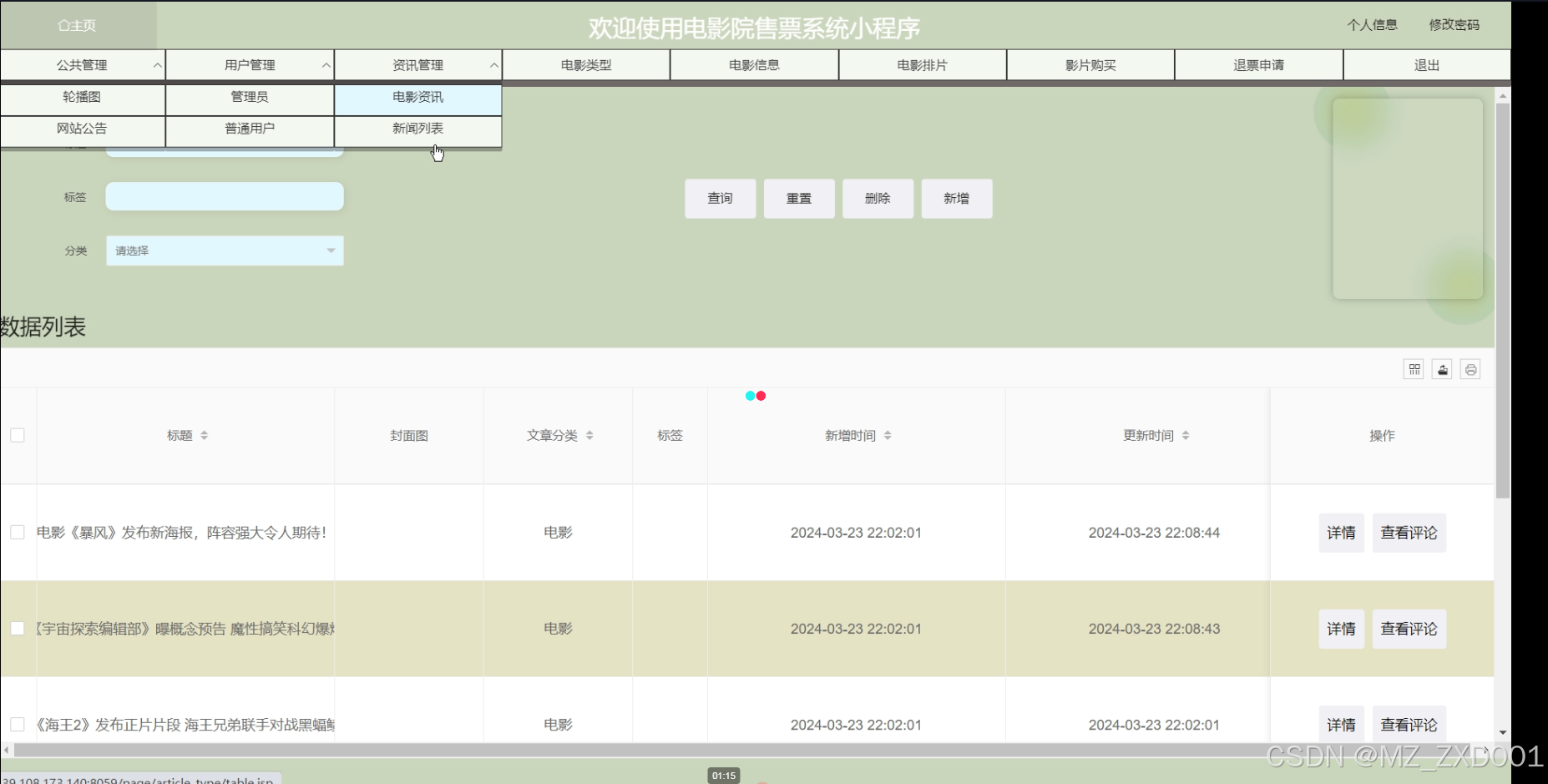 管理员点击资讯管理,会出现所有电影资讯、新闻列表,并支持增删改查,如图5-9所示。
