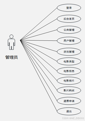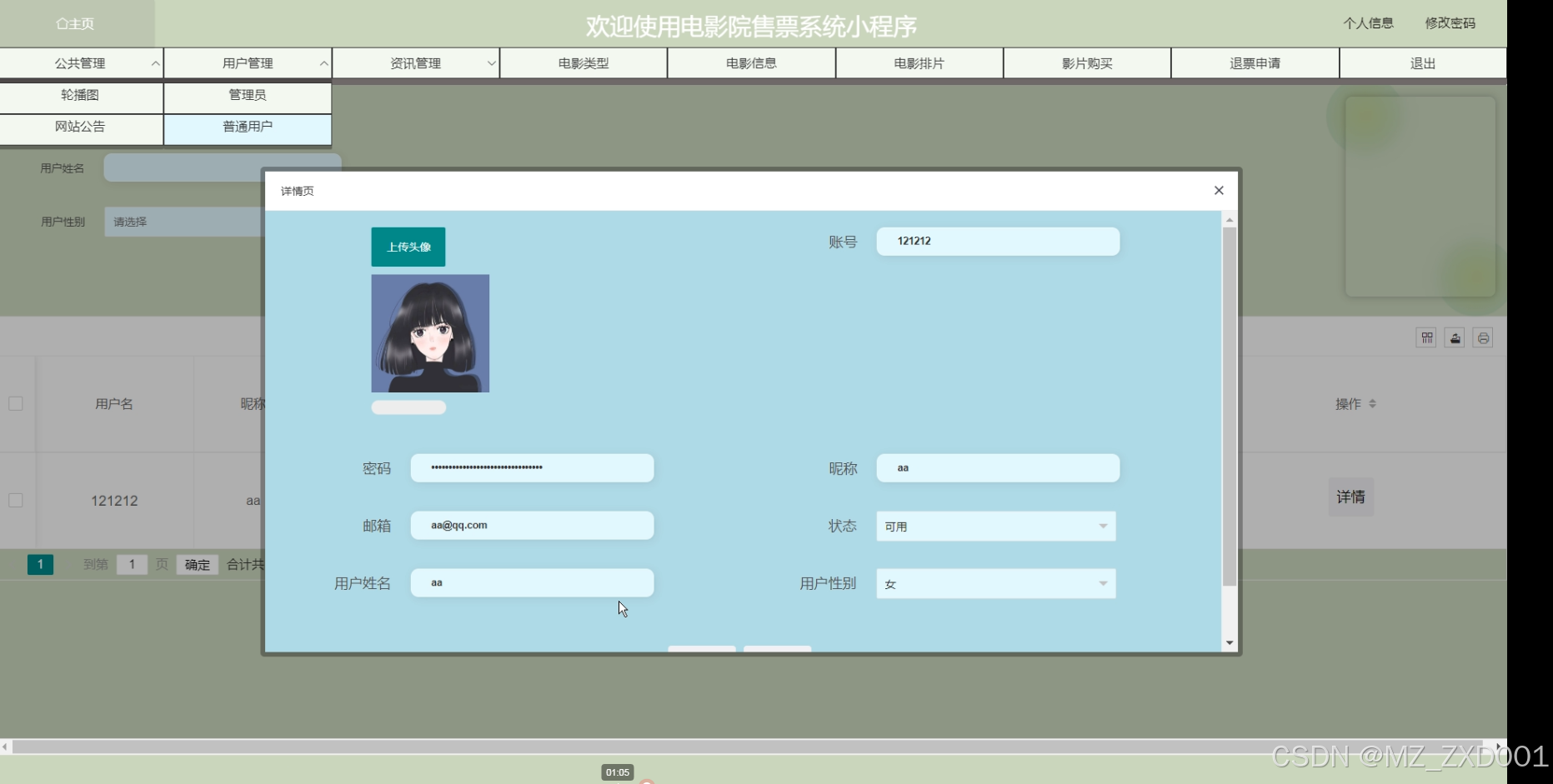 通过管理员功能页面,用户可以查看首页、系统用户(管理员、普通用户)、电公共管理、用户管理、资讯管理、电影类型、电影信息、电影排片、影片购买、退票申请、退出、个人信息、修改密码、影片购买统计图等,并且可以根据需要进行相应的操作,如图5-6所示。