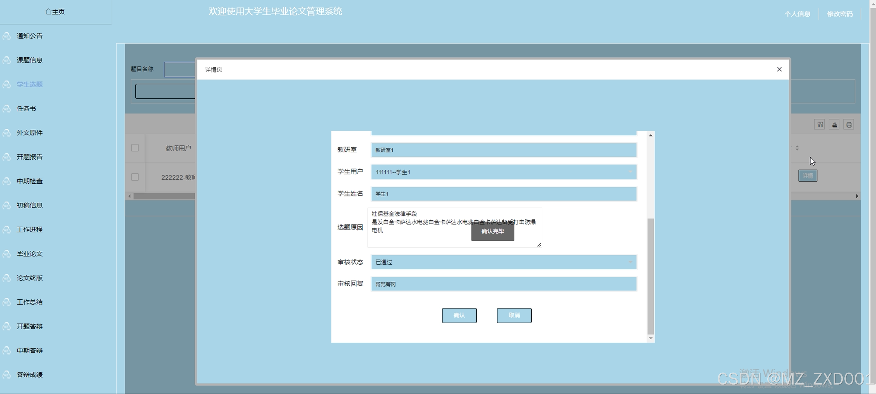 (3)学生选题:系主任用户可以查看选题详情列表信息,查看学生的选题情况,并对学生的选题信息进行审核和回复处理。
