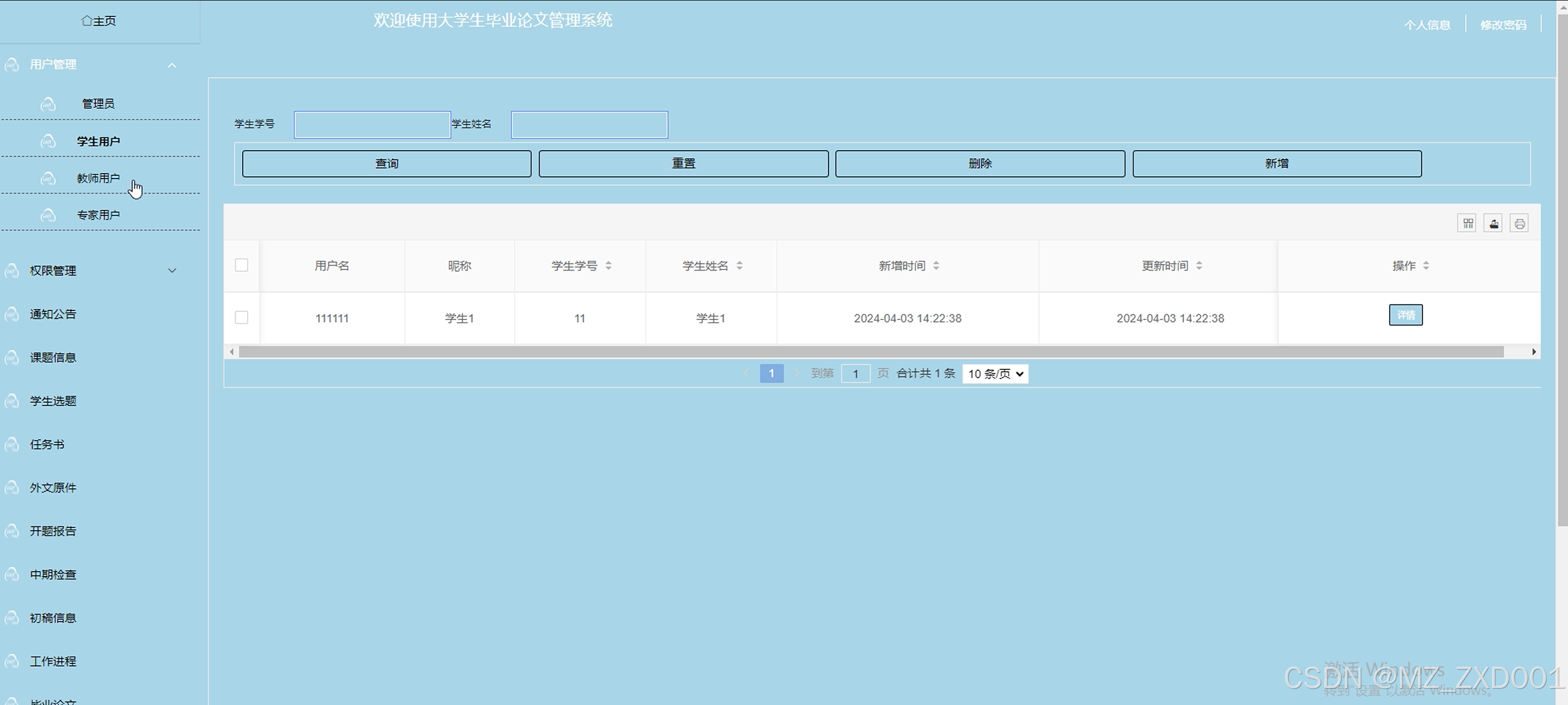- 用户管理:管理员对系统用户(管理员、学生用户、教师用户、专家用户)进行管理,可以对系统用户进行增删改查操作。