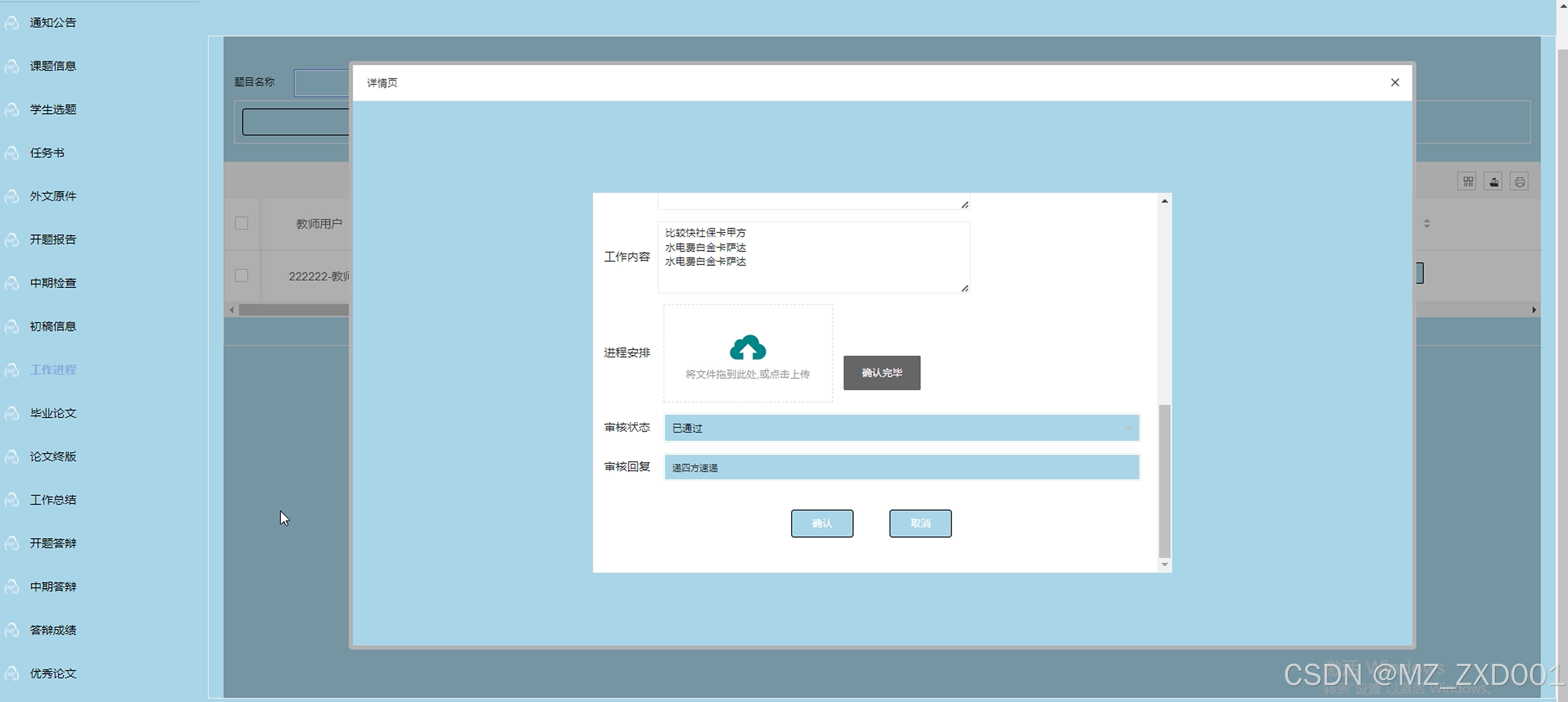 工作进程:实时展示教师所指导学生论文的工作进度,包括各阶段任务完成情况、教师反馈记录、学生修改进度等,帮助教师监控指导进程,合理安排指导工作。图5-9所示。