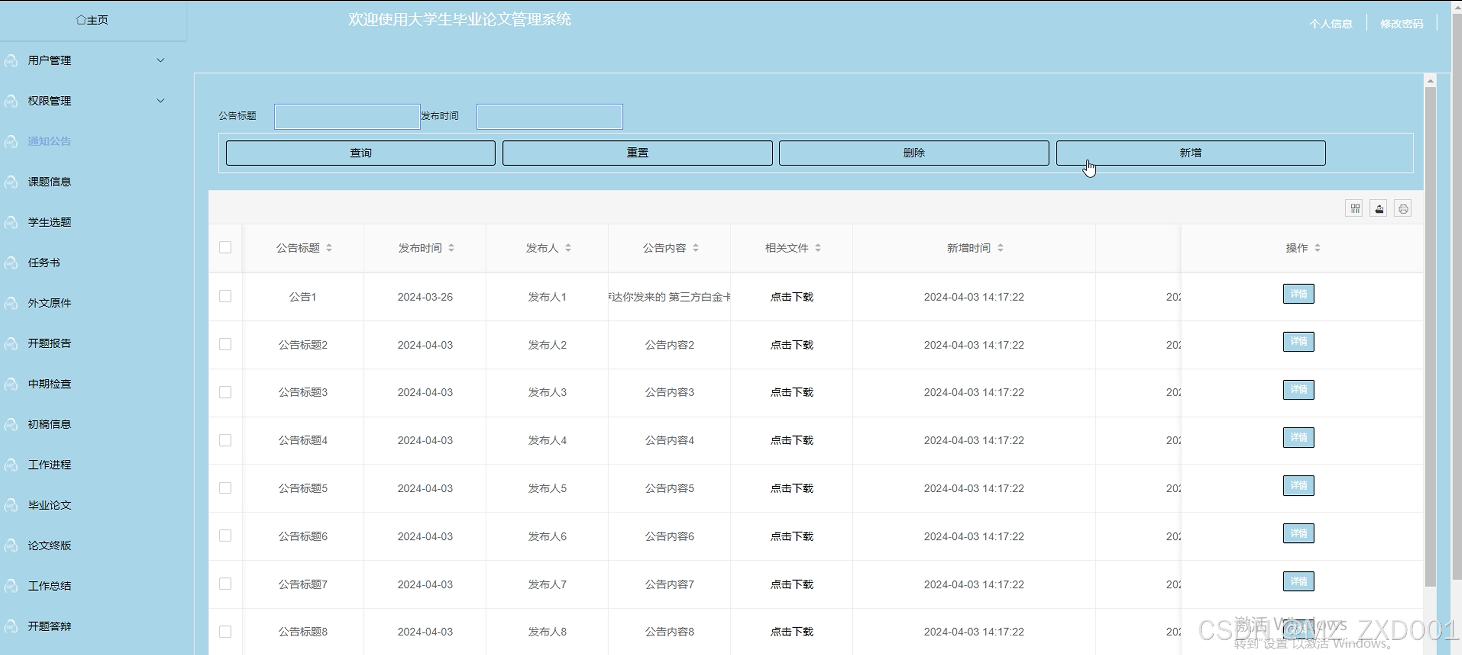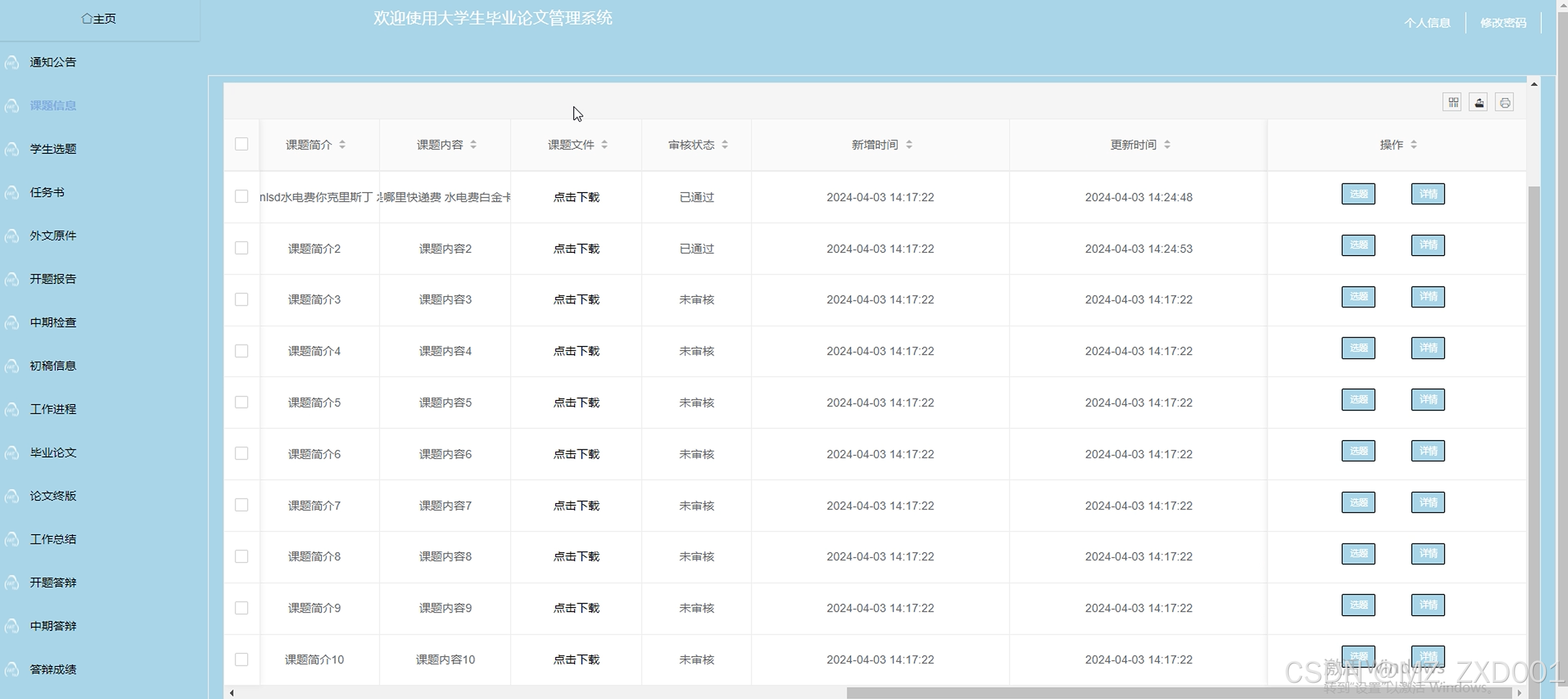 - 课题信息:老师用户可以查看课题信息列表详情,也能添加新的课题信息给学生进行选择。