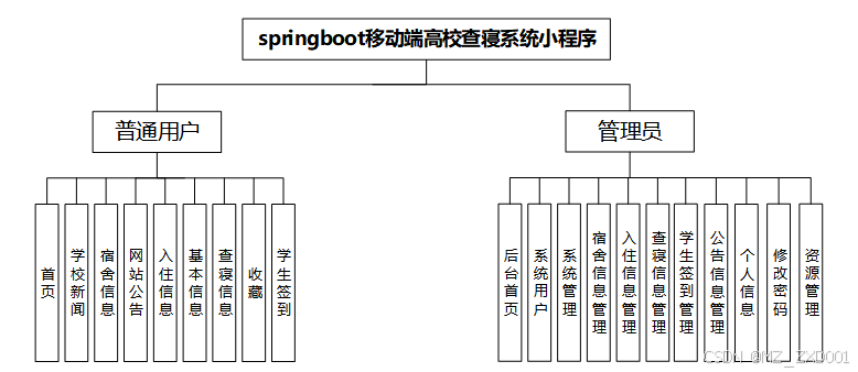 移动端高校查寝系统小程序划分为了用户管理模块和管理员模块这两大部分。