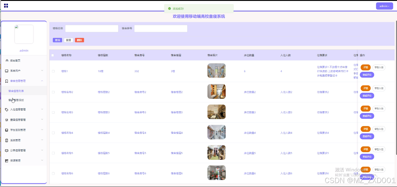 宿舍信息管理:点击“宿舍信息”这个菜单,可以查看到宿舍信息,进行查询,添加、删除等操作。界面如下图所示。