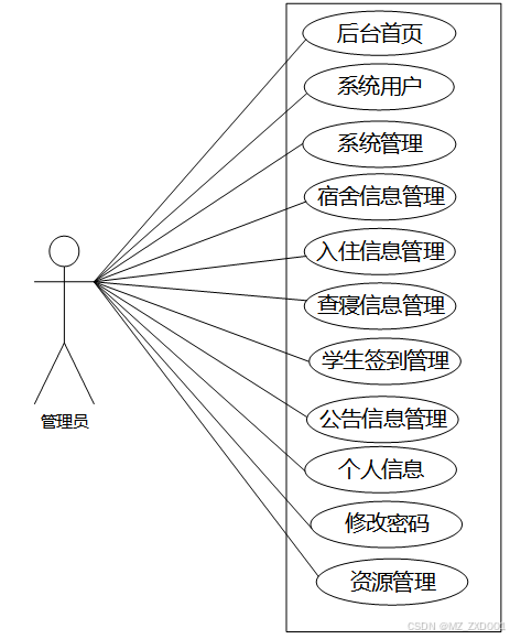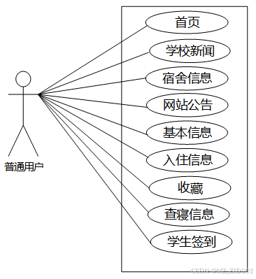 系统用例分析是对移动端高校查寝系统小程序中各个功能模块的用户需求和行为进行分析,以识别和描述不同的用户用例。通过系统用例分析,可以深入了解用户在平台上的操作流程,为系统设计和开发提供指导,并确保平台能够满足用户的需求和期望。