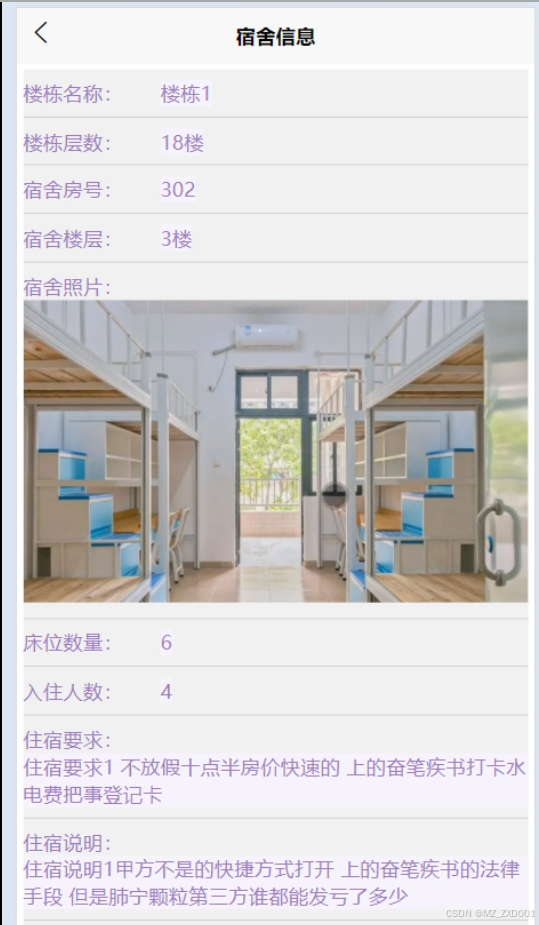 (4)宿舍信息:当用户点击下方导航栏“宿舍信息”这一菜单按钮,会显示管理员在后台发布的所有的宿舍信息,可以查看详情,进行点赞、收藏、评论等。