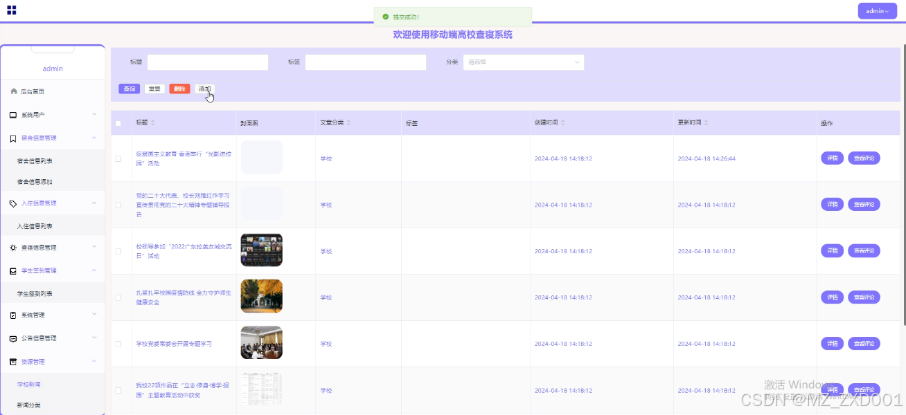 学校资讯:可以发布到学校资讯详情,进行查询,添加、删除等操作。界面如下图所示。