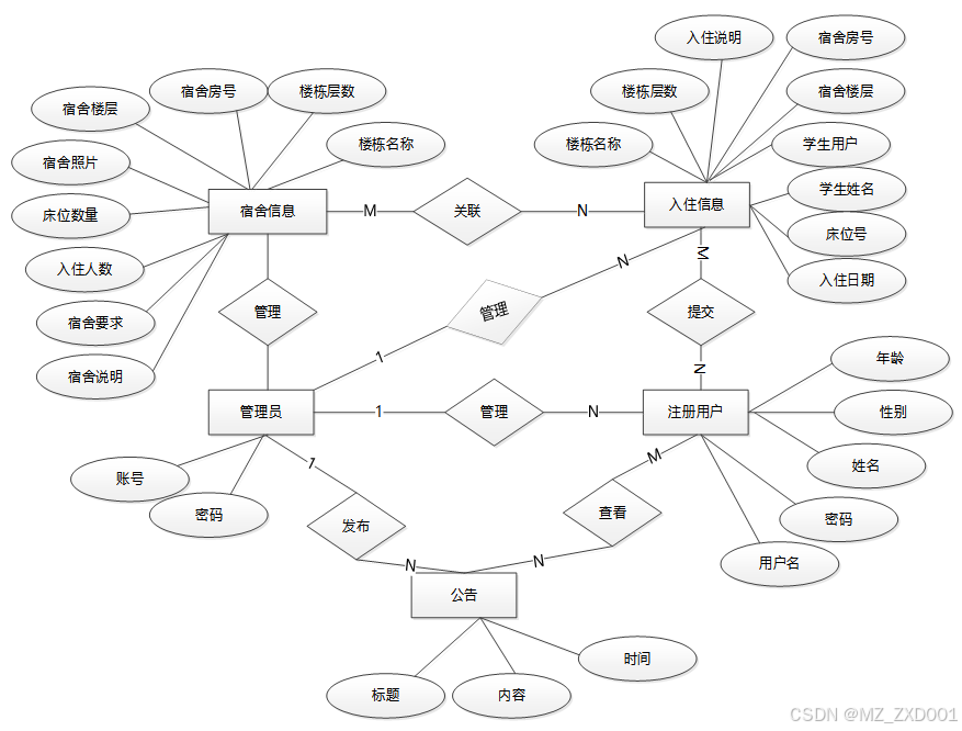 数据库概念结构设计主要涉及数据库的实体和实体之间的关系。通过实体-关系模型或者其他适当的模型,我们将定义系统中涉及的各个实体以及它们之间的联系。下面是整个移动端高校查寝系统小程序的总E-R关系图。