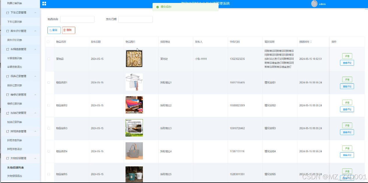 失物招领管理,在失物招领管理页面可以查看物品名称、发布日期、拾取地址、手机号码等编辑信息,并可根据需要进行修改或删除操作,如图5-15所示。
