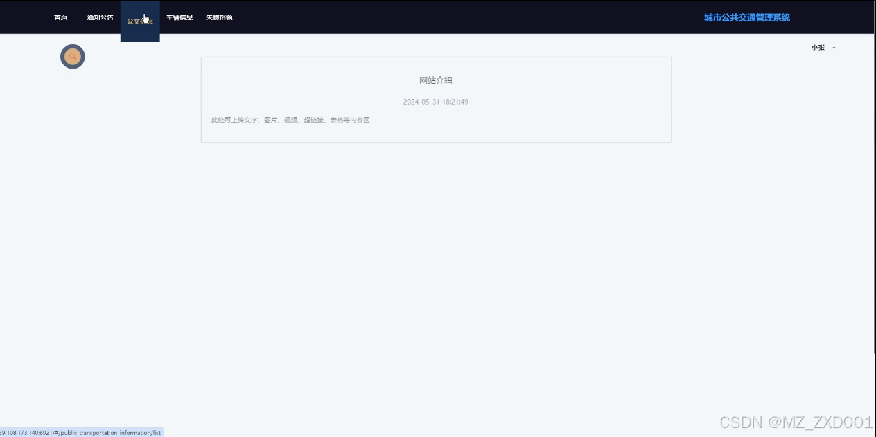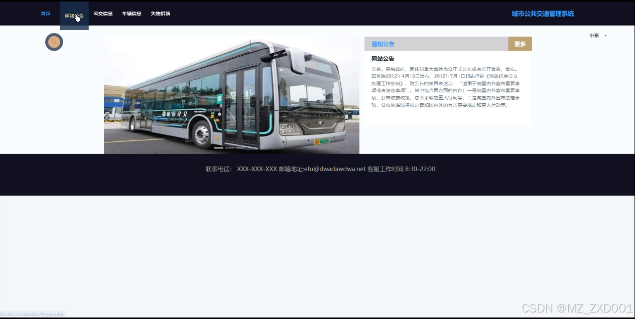 In the current wave of smart city construction, urban public transportation management is facing unprecedented challenges and opportunities. In order to meet the growing travel needs of citizens and improve the operational efficiency and service quality of public transportation systems, we have introduced an urban public transportation management system based on SSM (Smart Service Management)+Vue technology. This system combines the intelligent service management concept of SSM with the excellent front-end development capabilities of Vue framework, and achieves real-time monitoring, intelligent scheduling, and data analysis of public transportation resources through advanced information technology means. This not only helps optimize bus route planning, improve vehicle operation efficiency, but also provides citizens with a more convenient and comfortable travel experience. The application of SSM+Vue urban public transportation management system will promote the development of urban public transportation management towards digitalization, intelligence, and humanization, contributing an important force to the construction of smart cities.