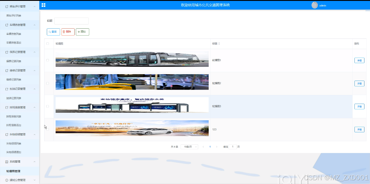 系统管理:进入后台首页工具栏点击“系统管理”这个按钮可以查看所有轮播图信息,可以进行详情查看、删除、查看评论等操作。如图5-13所示。