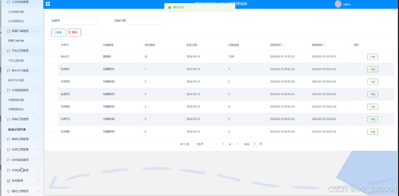 保养记录管理,在保养记录管理页面可以查看车牌号、车辆规格、座位数量、保养日期等编辑信息,并可根据需要进行修改或删除操作,如图5-14所示。