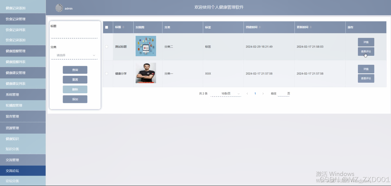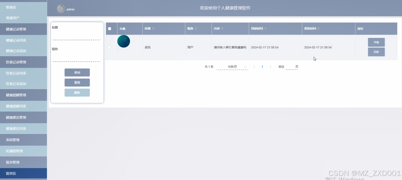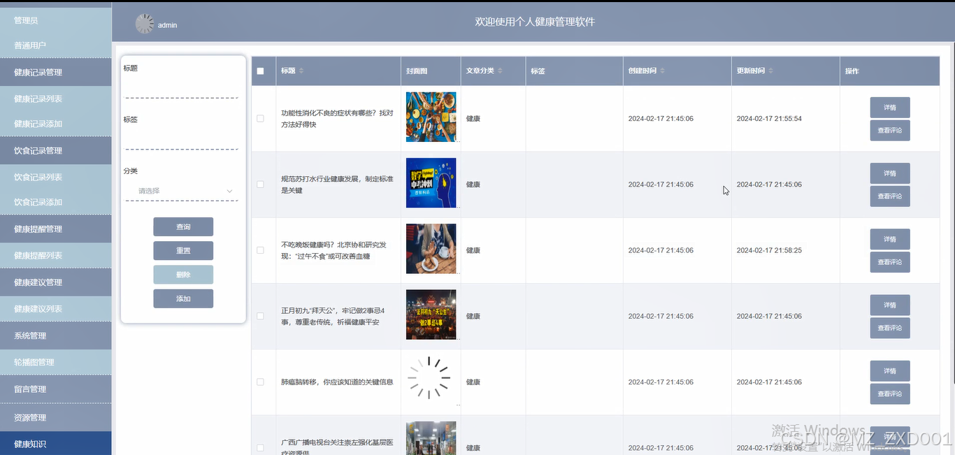 (5)健康提醒管理:管理员点击可查看健康提醒列表。