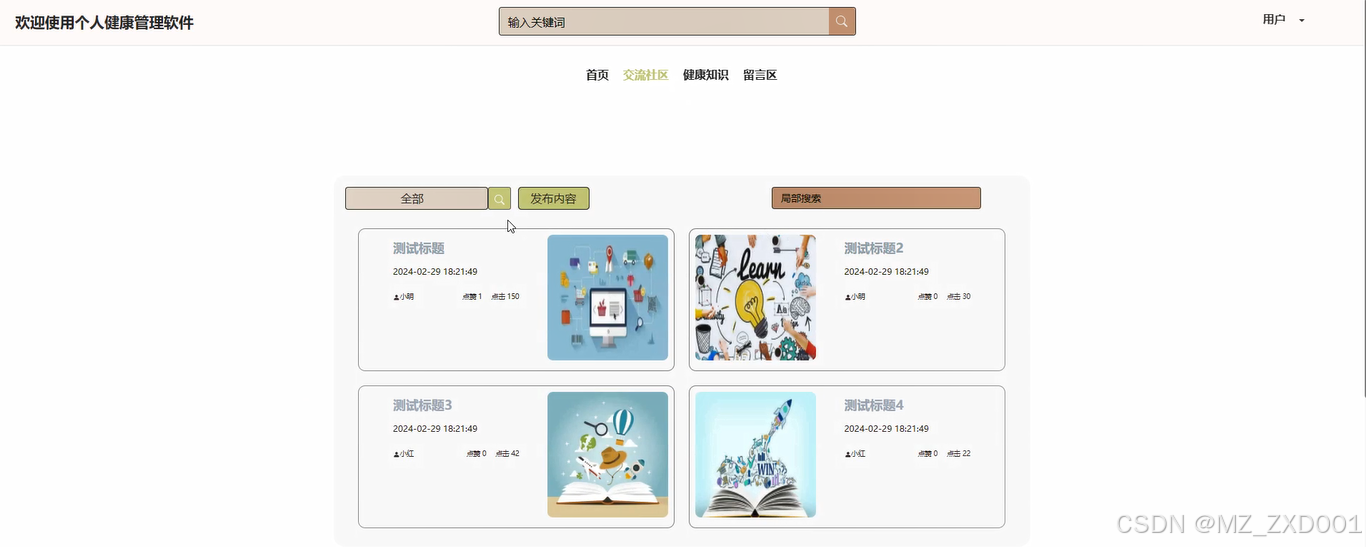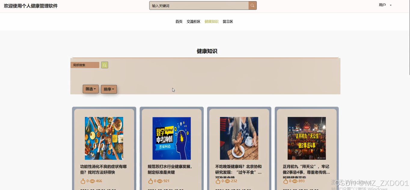 (3) 健康知识:用户点击可通过局部搜索进行查看健康知识,同时可对知识文章进行点赞、收藏和评论。