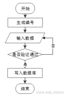 用户成功登入系统后就能够实现增加数据的操作,增加数据的编号由系统生成,用户不能随意填写,除了编号以外,其他增加信息用户自己填写,填写后的信息需经过系统验证,验证通过后即可完成数据新增,数据新增的流程图如下图2-1所示。