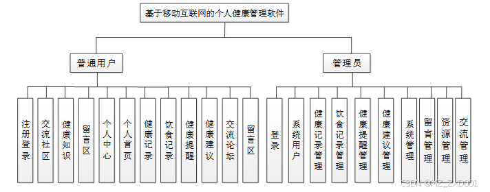 按照基于SSM+VUE个人健康管理软件的角色,主要包括注册用户模块和管理员这两大功能模块,各模块功能内容如下: