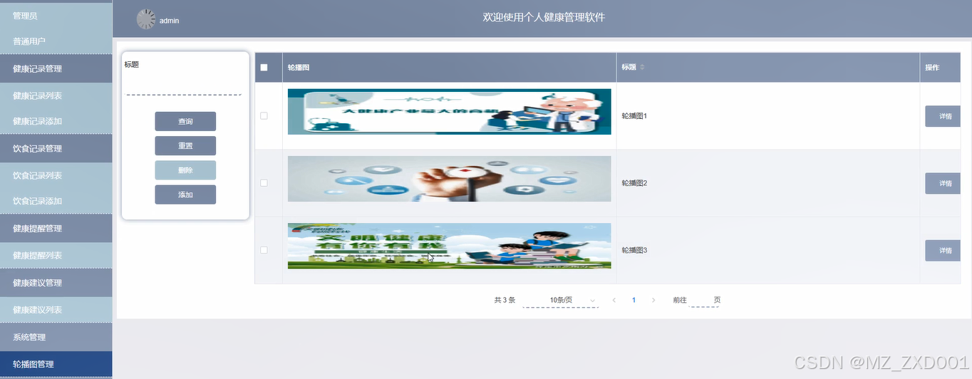 (7)系统管理:当管理员点击“系统管理”时,可查看轮播图; 如需添加新的轮播图,点击右侧“添加”按钮,上传图片,输入标题,点击“确认”按钮进行添加;同时可对轮播图进行增删改查。