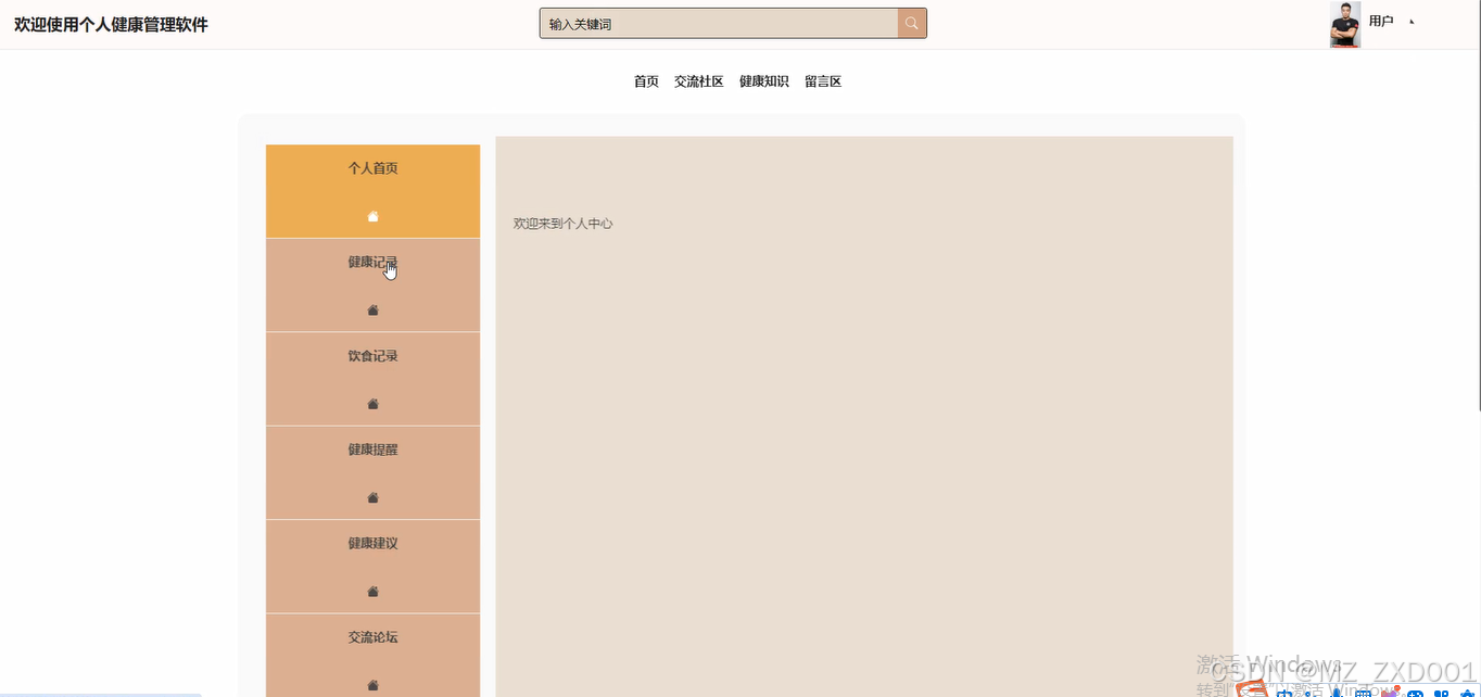 (5)个人中心:用户点击头像可查看“个人中心”,包括个人首页、健康记录、饮食记录、健康提醒、健康建议、交流论坛和留言区。