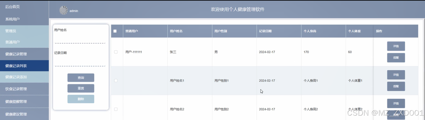 (3)健康记录管理:管理员点击可查看健康记录列表和健康记录添加;通过搜索用户姓名查看用户健康详情,同时可对用户进行健康提醒。