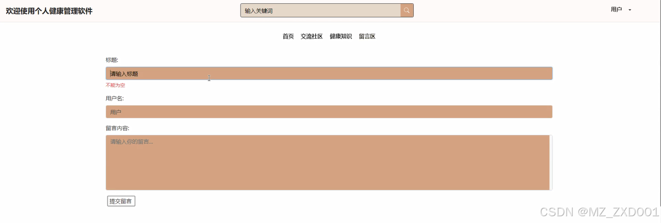 (4)留言区:用户点击可输入标签、用户名和留言内容,进行发布留言区内容。