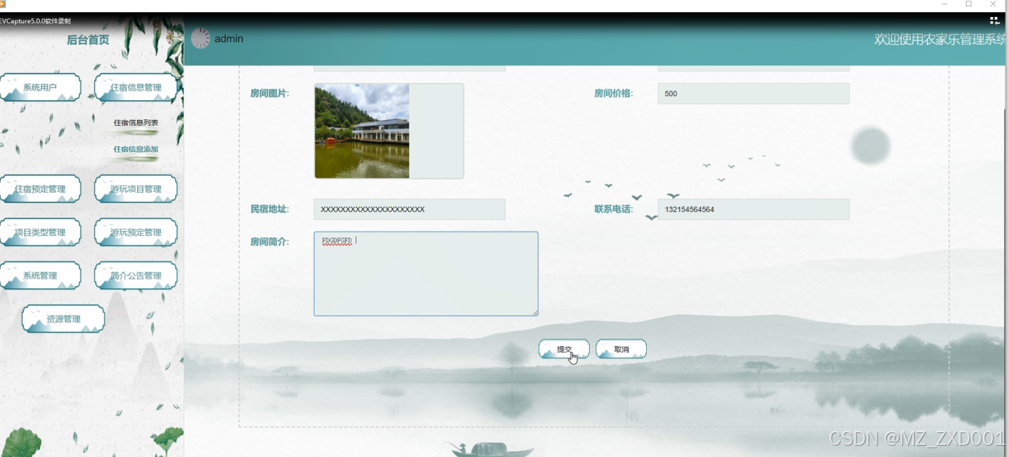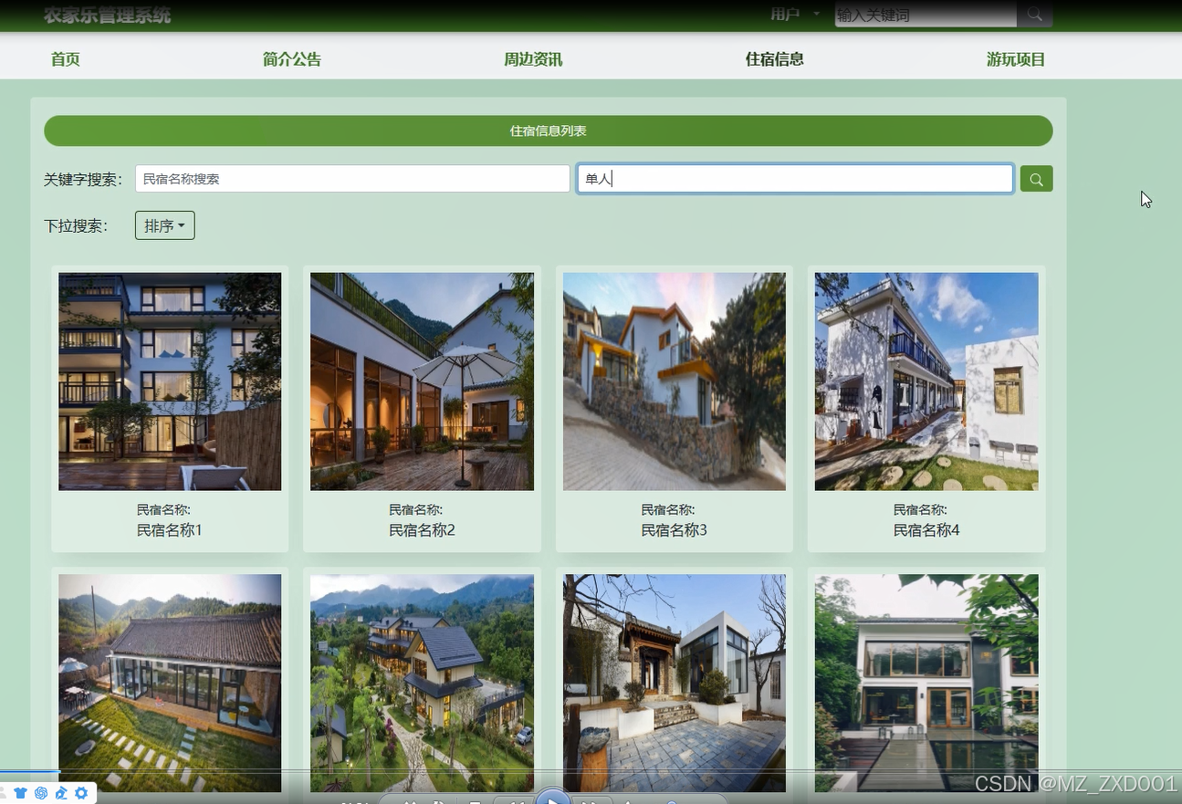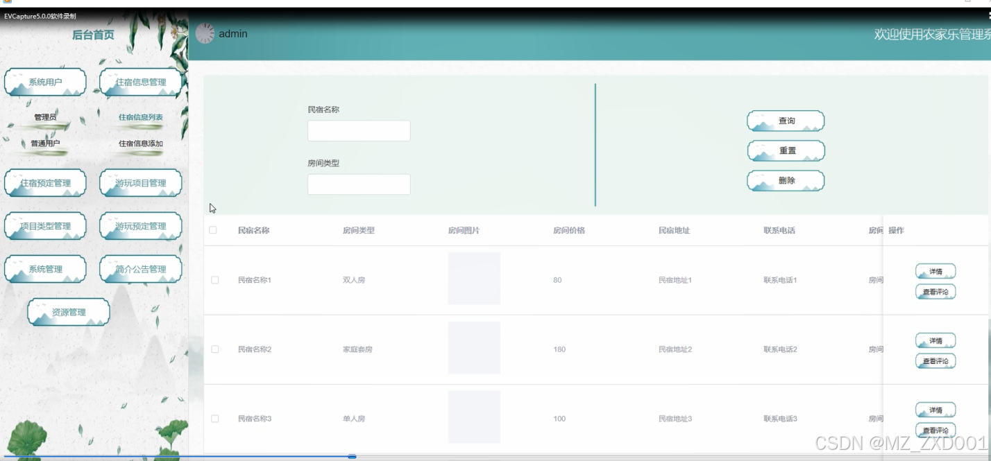 - 住宿信息管理:管理员可以录入、更新农家乐的住宿信息,如房间类型、数量、价格等,并对住宿预订进行管理,如查看预订情况、确认订单等。