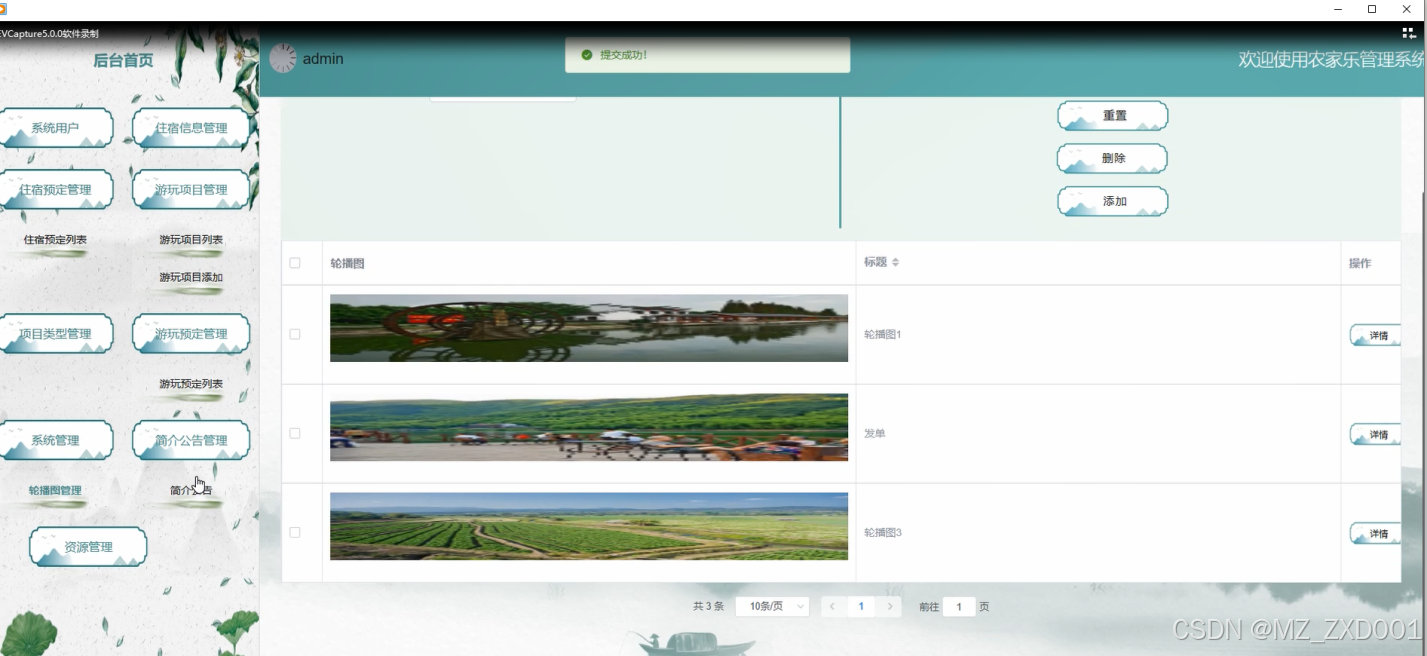 - 系统管理:上传、更新系统首页的轮播图,用于展示农家乐的特色图片或宣传信息。