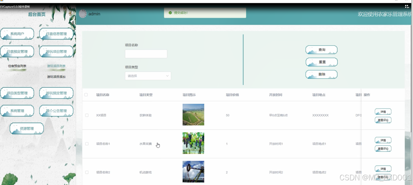 - 项目类型管理:管理农家乐提供的游玩项目类型,如农事体验、户外运动等,可以添加、修改或删除项目类型。