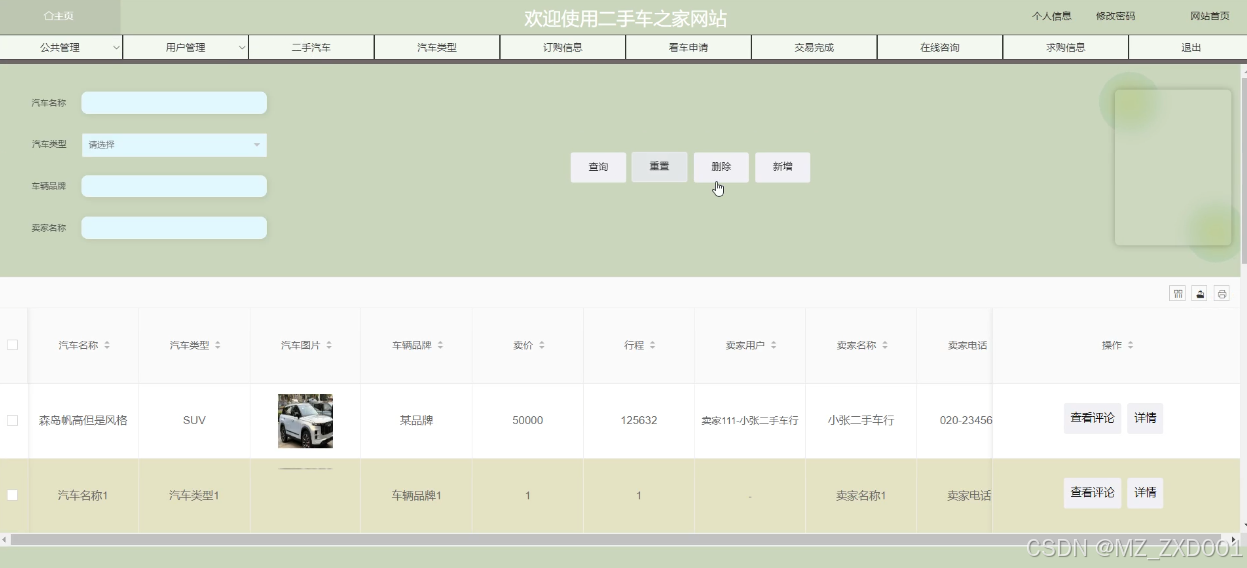 (4)二手汽车:管理员点击“二手汽车”会显示出所有的二手汽车信息,支持输入车辆名称对二手汽车进行查询,如果想要添加新的二手汽车,点击“添加”按钮,输入详细信息,点击“提交”按钮就可以添加了,同时可以选择某一条二手汽车,点击“删除”进行删除。也可以对用户提交的二手汽车评论的信息进行管控。
