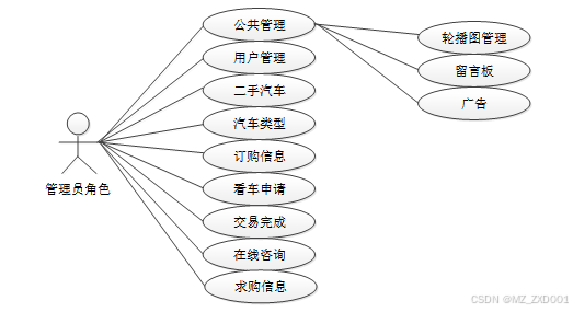 管理员管理模块:公共管理(轮播图、留言板、广告)、用户管理、二手汽车、汽车类型、订购信息、看车申请、交易完成、在线咨询、求购信息