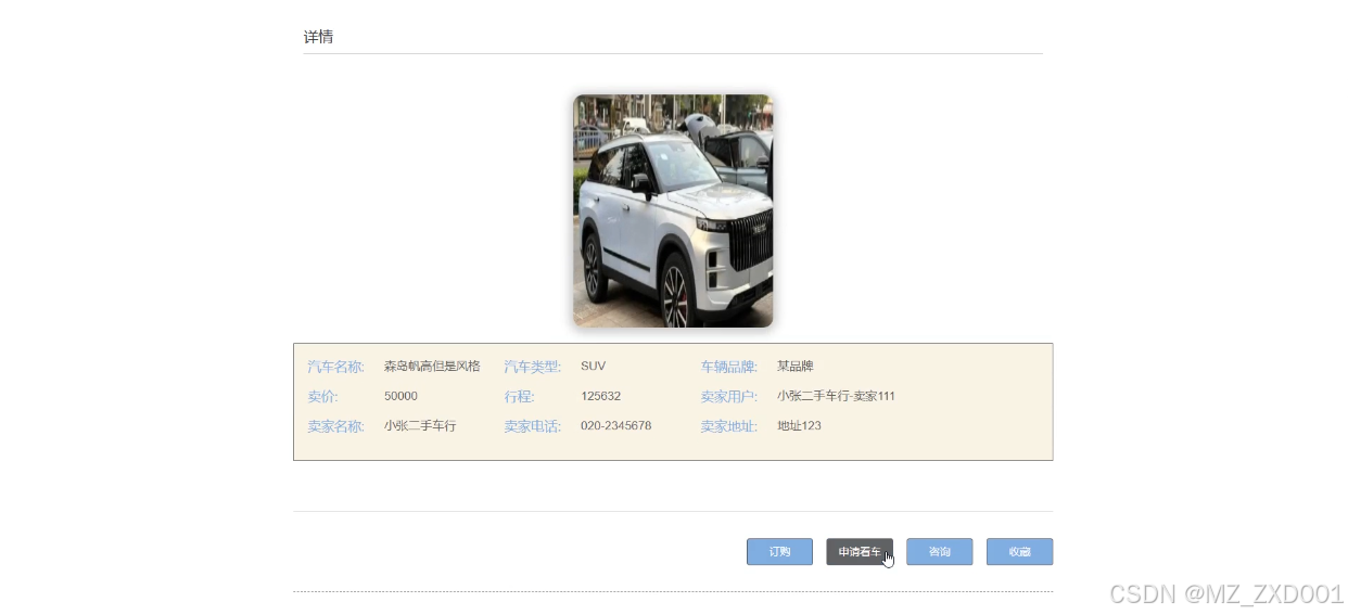 (4)二手汽车:用户可以查看二手汽车信息,在查询到自己想要了解的二手汽车的时候,可以进入查看详细的介绍包括汽车名称、汽车类型、车辆品牌、卖价、行程、卖家用户、卖家名称、卖家电话、卖家地址等信息。点击“订购”这一按钮以后会跳转到汽车订购信息填写的界面,根据提示填写好订购的信息,点击“提交”以后订购就完成了,在二手汽车详情这个界面,同时支持用户对喜欢的二手汽车进行申请看车、咨询、收藏和评论的功能。