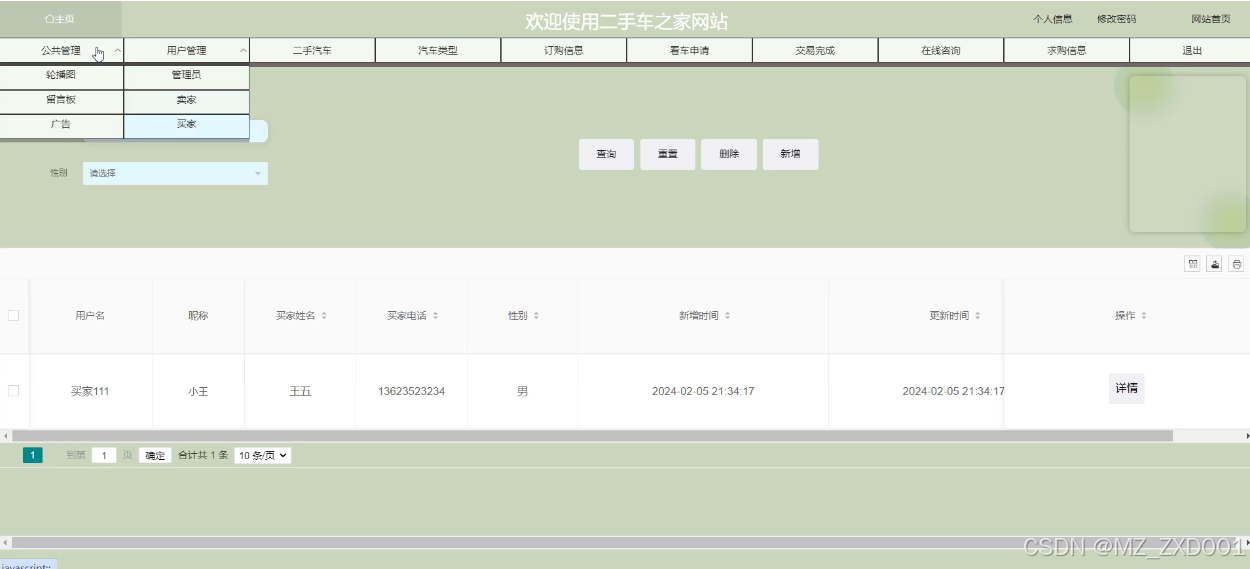 (3)用户管理:管理员可以对二手车之家网站中的管理员、买家用户和卖家用户进行增删改查。
