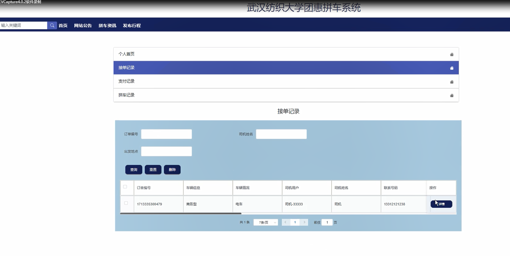司机可以查看接单记录,包括拼车订单的详情、乘客信息等,方便司机查看和管理自己的接单情况。接单记录界面如下图所示。