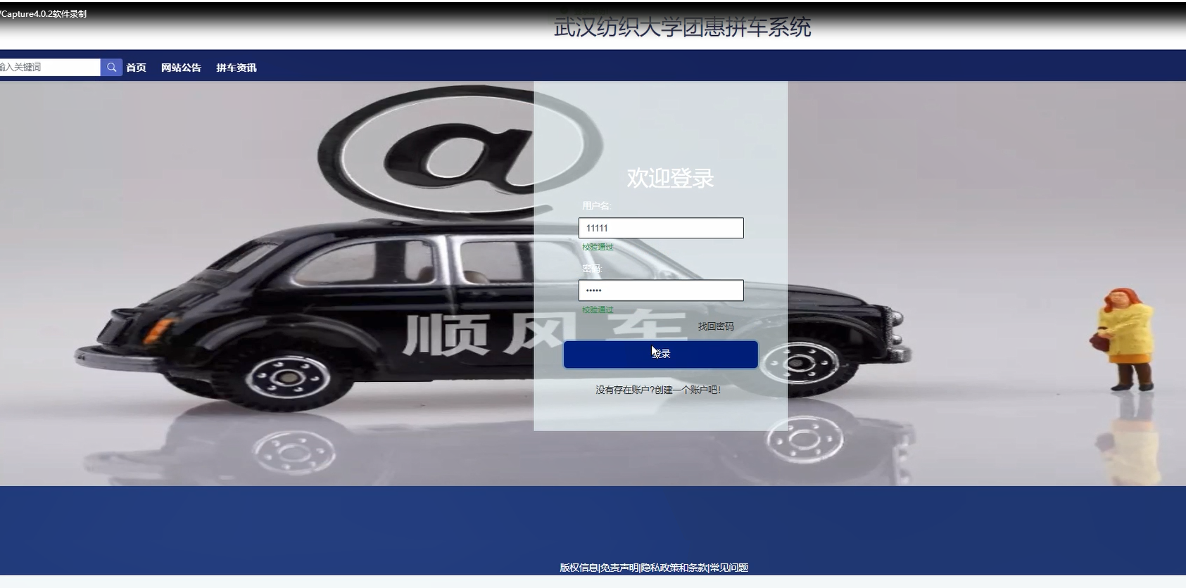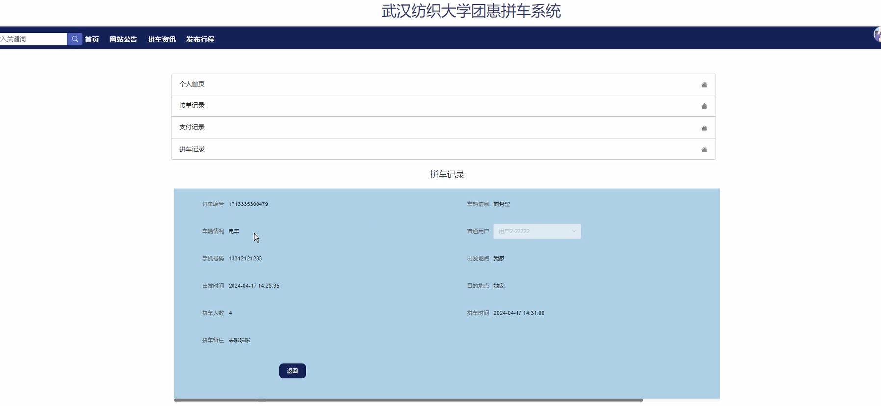 第四章对武汉纺织大学团惠拼车系统进行实现,并贴出相关页面截图,语言描述出具体功能实现的操作方法。