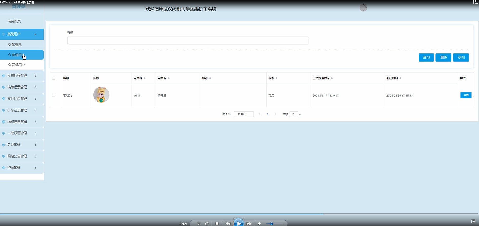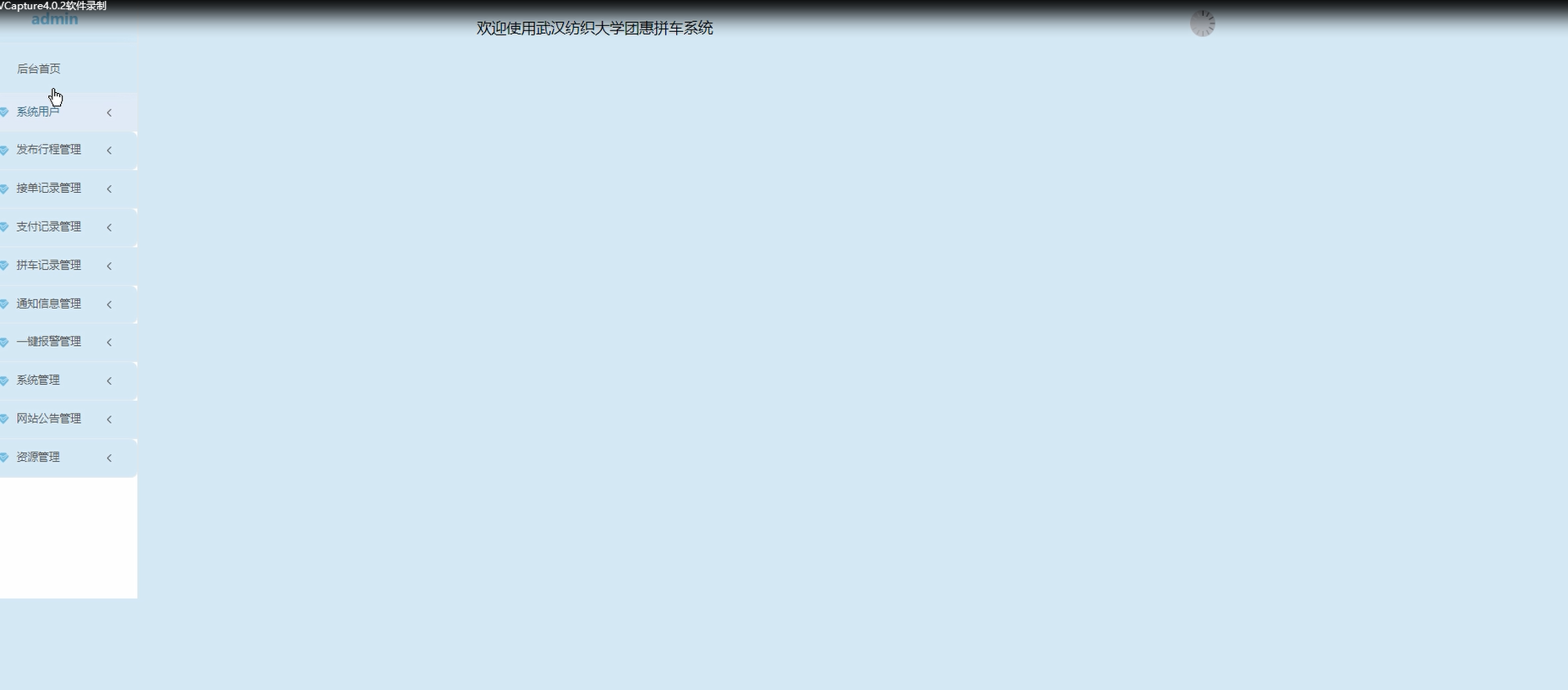 进入系统后首先要进行登录,验证你的身份,赋予你不同的权限。当你成功登录后,页面会有多个板块,分别是后台首页、系统用户、发布行程管理、接单记录管理、支付记录管理、拼车记录管理、通知信息管理、一键报警管理、系统管理、网站公告管理、资源管理。里面界面简单易懂,根据标示可以直接进行方便快捷的操作。