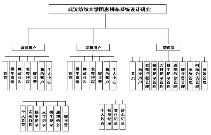 根据市场调研得到的信息数据,结合国内外前沿研究,利用相关系统开发和设计方法,最终设计出武汉纺织大学团惠拼车系统。