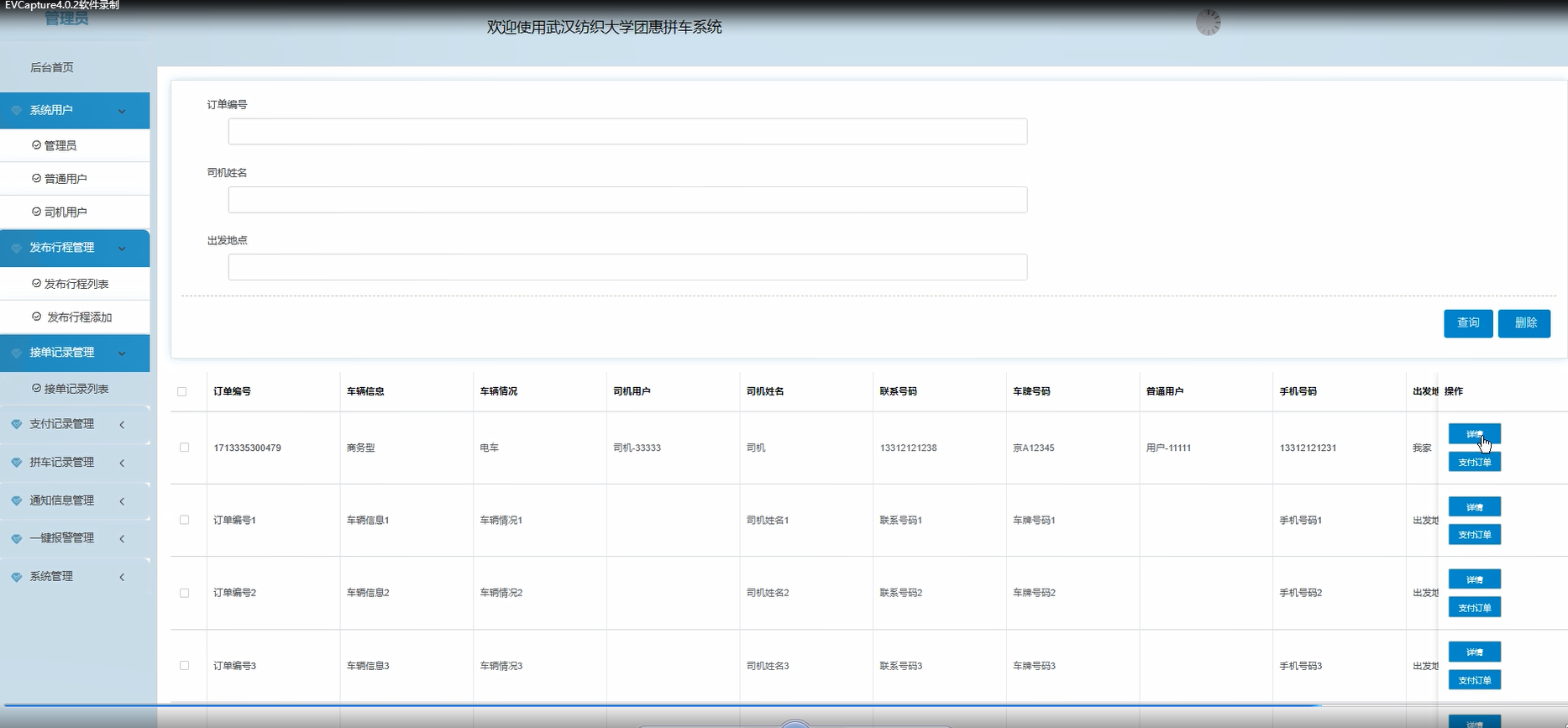 允许管理员管理拼车系统的接单记录,包括查看接单情况、处理异常订单、确认订单状态等操作,确保拼车服务的顺利进行。接单记录管理界面如下图所示。
