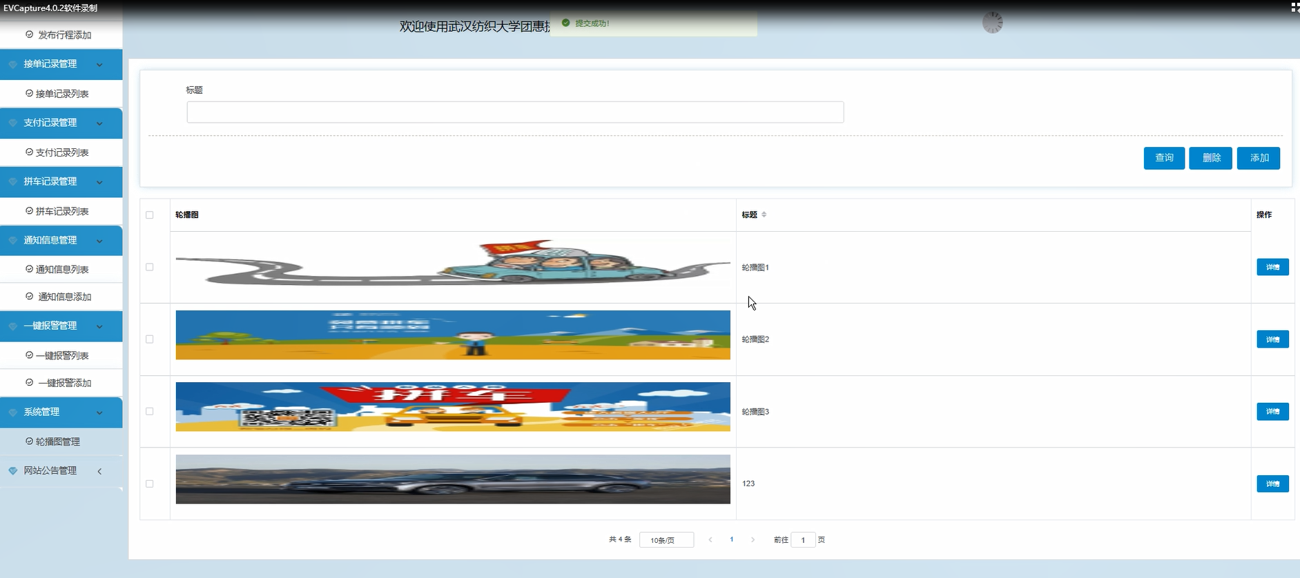管理员可以对系统前台展示的轮播图进行增删改查,方便用户进行查看。系统管理界面如下图所示。