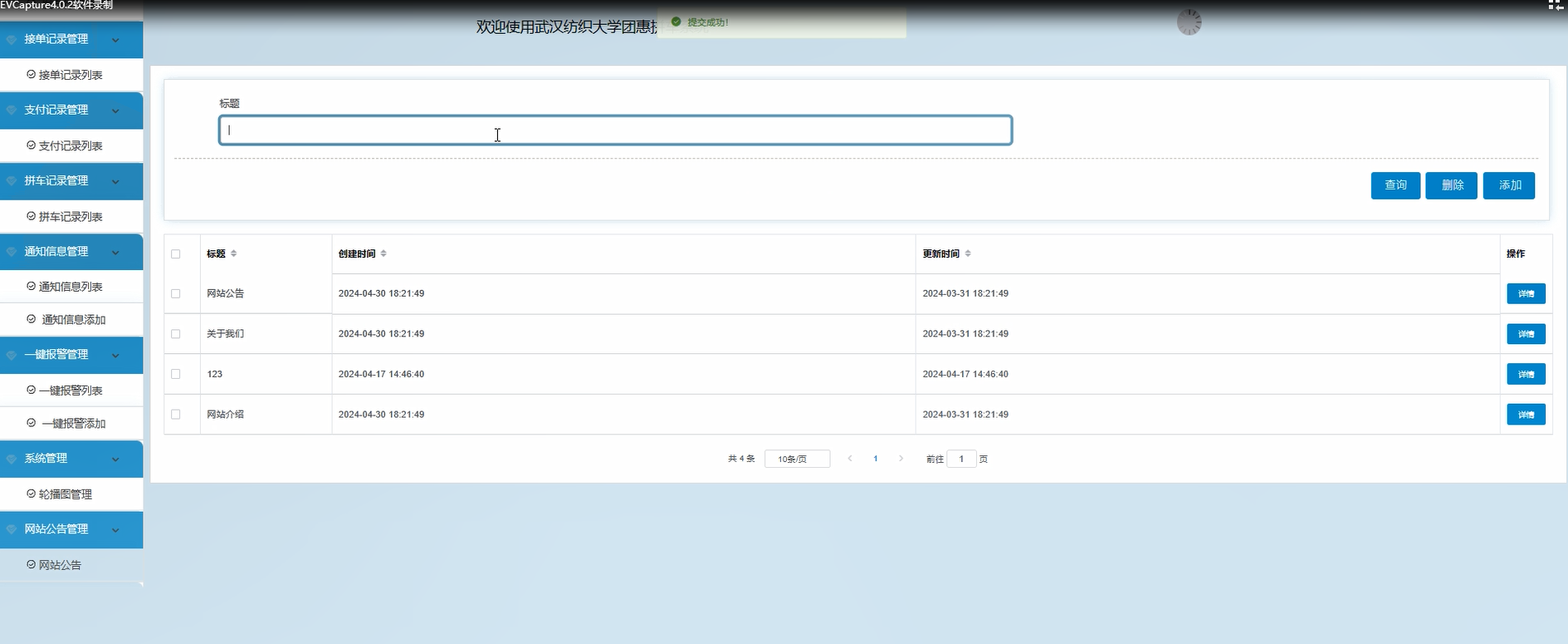 管理员可以对系统前台展示的通知公告进行增删改查,方便用户进行查看。网站公告管理界面如下图所示。