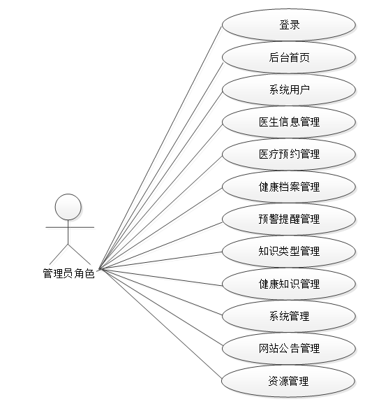 农村空巢老人健康管理系统管理员包含登录、后台首页、系统用户、医生信息管理、医疗预约管理、健康档案管理、预警提醒管理、知识类型管理、健康知识管理、系统管理、网站公告管理、资源管理等功能。管理员用例图如下所示: