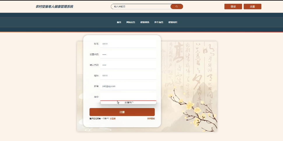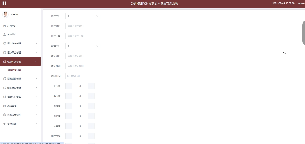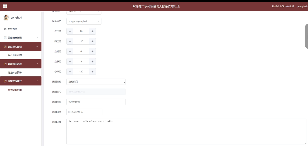 The system is divided into three roles: family user, doctor user, and administrator. Family users view health information, make appointments with doctors, manage health records, etc.; doctor users can manage appointment information, health records, and warning reminders; administrators are responsible for user management doctor information maintenance, health knowledge release, and system configuration. The system uses a SpringBoot Java technology stack, combined with a front-end and back-end separation architecture, achieve efficient data interaction and security management. Through this system, medical resource allocation can be optimized, health management response speed can be improved, and convenient health monitoring and medical services can be for empty nesters.