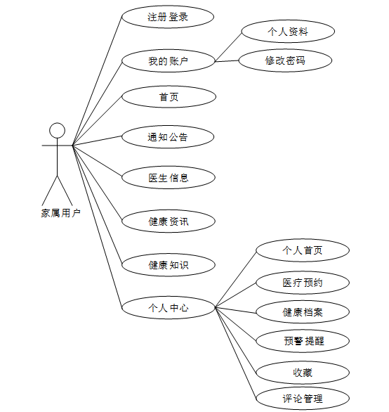 农村空巢老人健康管理系统中家属用户包含注册、登录、我的账户、首页、通知公告、健康资讯、医生信息、健康知识、个人中心等功能。家属用户用例图如下所示: