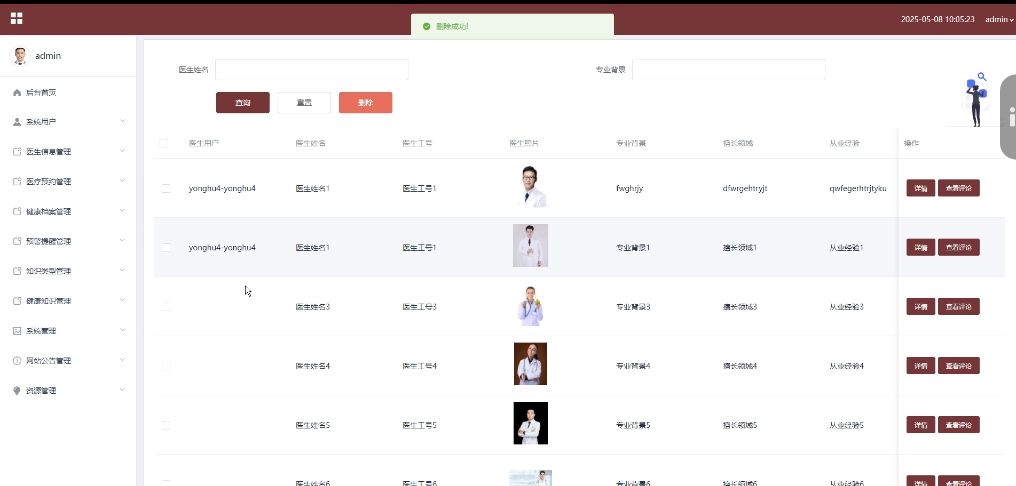 | 预期结果 | 提示删除成功,前端页面不在展示该医生信息 |