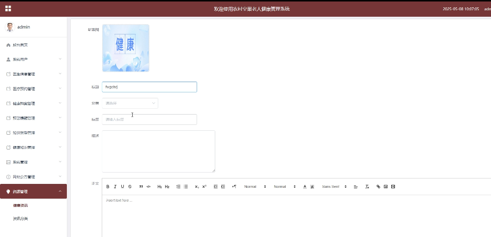 (11)资源管理:子菜单健康资讯列表、健康分类。资讯列表展示所有健康资讯信息,可进行增删改查,新增后会在前台展示,编辑后及时在前台变更,删除后将不再前台展示。可对健康分类进行增删改查操作