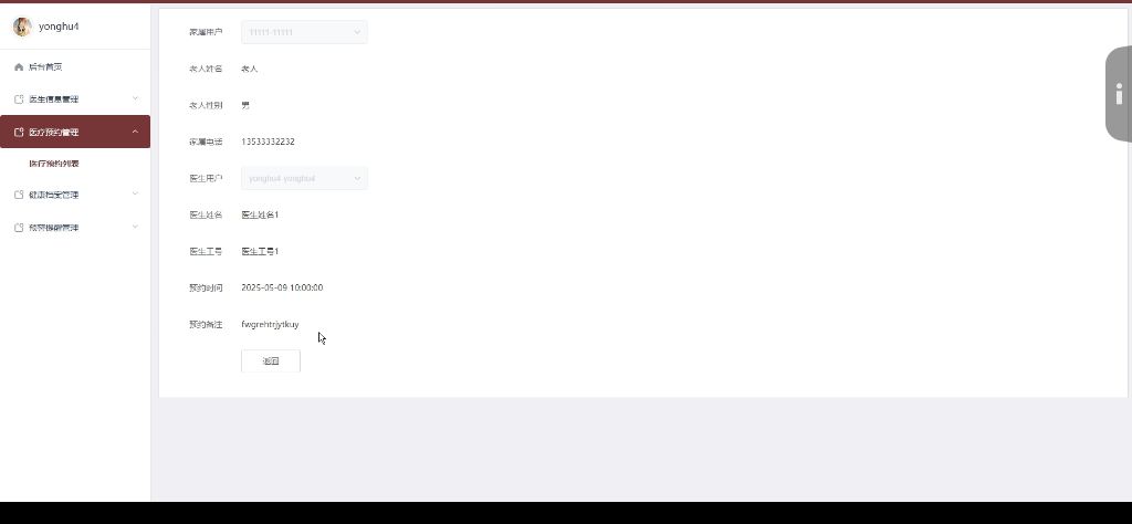 (5)医疗预约管理:展示所有家属用户提交的医疗预约信息,并可查看详情和审核预约信息。