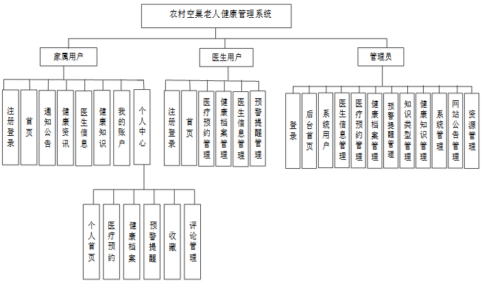 农村空巢老人健康管理系统主要涉及有家属用户、医生用户、管理员三个角色。其中家属用户包含注册、登录、我的账户、首页、通知公告、健康资讯、医生信息、健康知识、个人中心等功能;医生用户包含注册、登录、个人信息页、首页、医生信息管理、医疗预约管理、健康档案管理、预警提醒管理等功能;管理员包含登录、后台首页、系统用户、医生信息管理、医疗预约管理、健康档案管理、预警提醒管理、知识类型管理、健康知识管理、系统管理、网站公告管理、资源管理等功能。每个角色对应的功能模块如图所示。