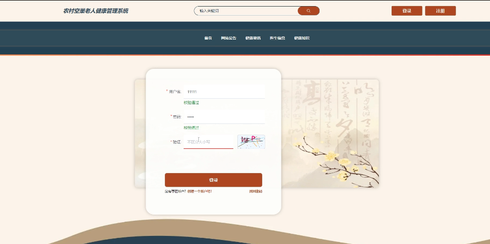 (2)用户登录:点击“登录”按钮,输入用户名、密码、验证码登录系统,登录时前端会自动校验用户名与密码以及该用户是否审核通过,审核通过的用户输入正确登录成功,输入错误会有提示信息。