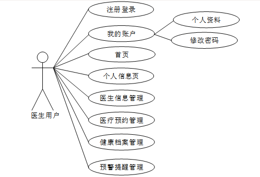 农村空巢老人健康管理系统中医生用户包含注册、登录、我的账户、首页、个人信息页、医生信息管理、医疗预约管理、健康档案管理、预警提醒管理等功能。医生用户用例图如下所示: