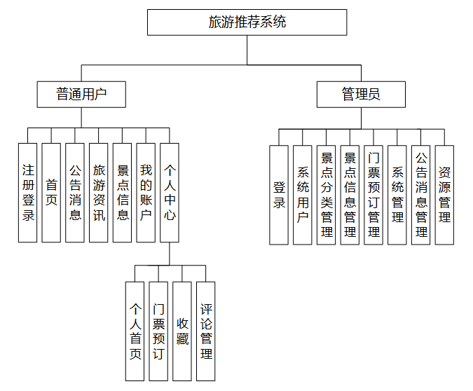 系统功能需求分析旨在明确旅游推荐系统应具备的核心功能,以满足用户和管理员双方的需求。对于普通用户而言,系统需提供注册登录功能,确保用户信息的安全存储与访问;首页展示公告消息、旅游资讯及景点信息,便于用户快速获取最新旅游动态;详细的景点搜索与浏览功能,包括通过景点名称、分类进行筛选,查看详情、点赞、收藏和评论景点,以及便捷的预订流程,涵盖预订时间、数量和金额等信息。个人中心模块则允许用户管理个人信息、查看历史预订记录及处理收藏和评论。针对管理员,系统需支持全面的后台管理功能,包括但不限于用户信息管理、景点分类及信息维护、门票预订审核、轮播图与公告消息更新、旅游资讯发布等,以保证系统的正常运行和内容的及时更新。此外,为提升用户体验,系统还需注重界面设计的人性化与交互过程的流畅性。具体描述如下: